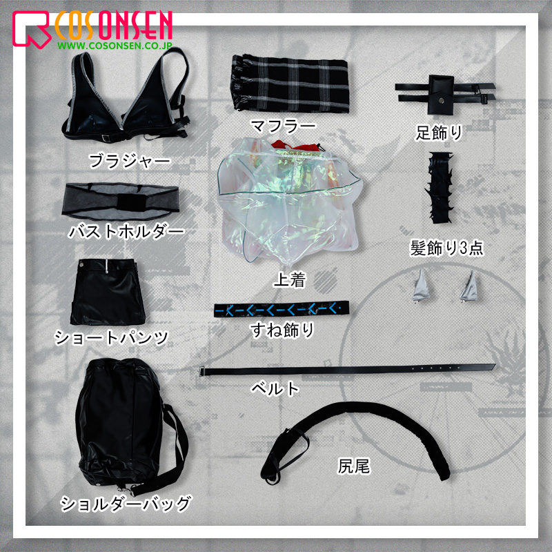 上着、ブラジャー、ショートパンツ、飾り物(バストホルダー、マフラー 、足飾り、髪飾り3点、すね飾り、ショルダーバッグ、尻尾、ベルト)