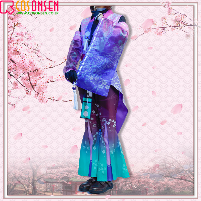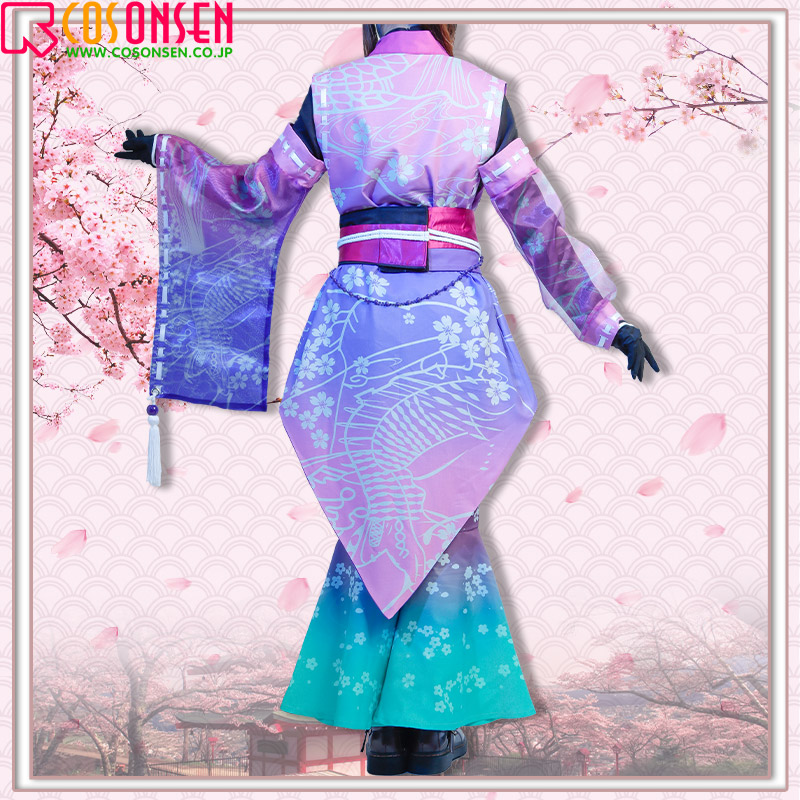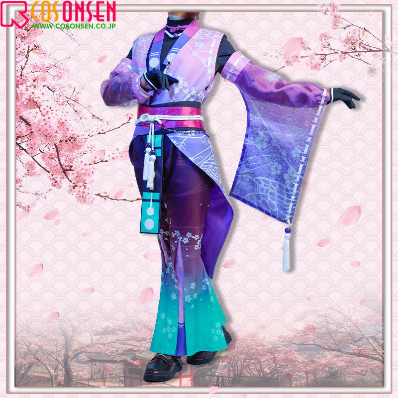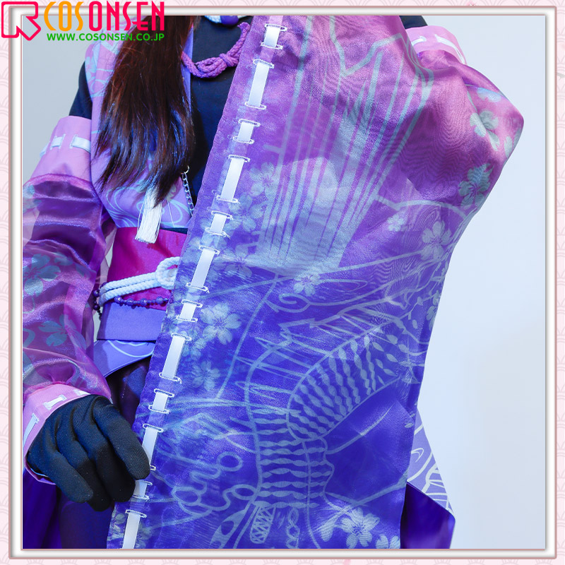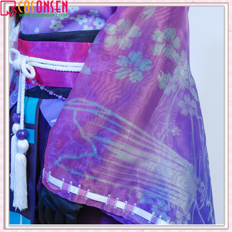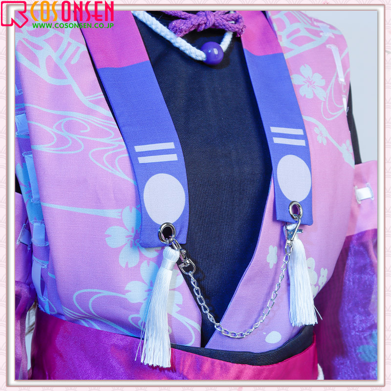 棉麻生地で製作しています。フロントに美しい桜の模様がプリントされています。飾り紐や腰帯をあしらって、華やかさを添えています。原作に忠実な絵柄が綺麗にプリントされて再現度が高いです。