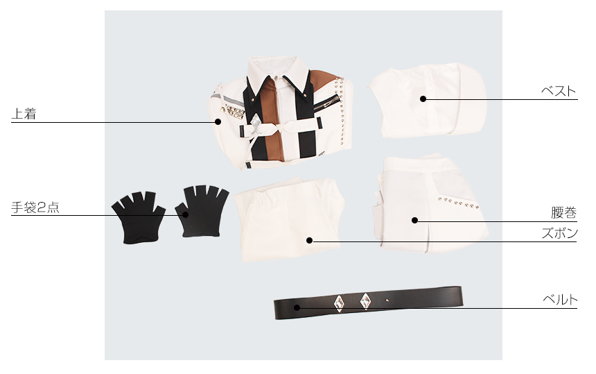 上着、ベスト、ズボン、飾り物(手袋2点、腰巻、ベルト)