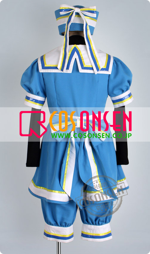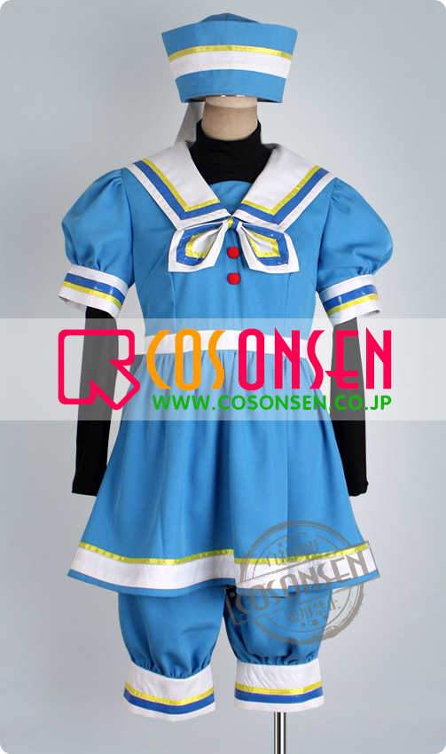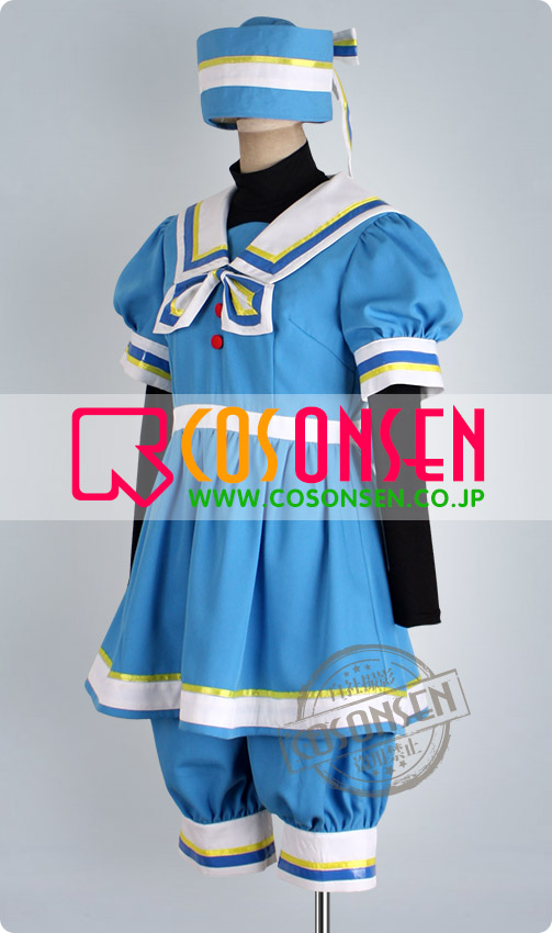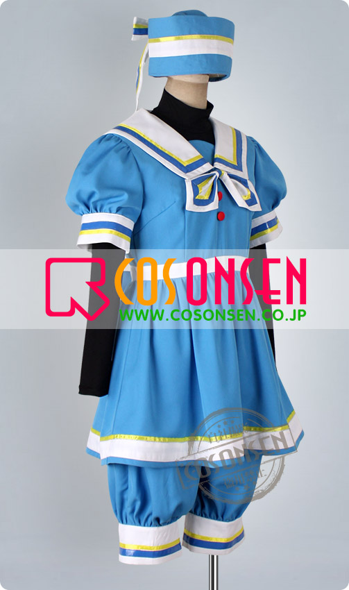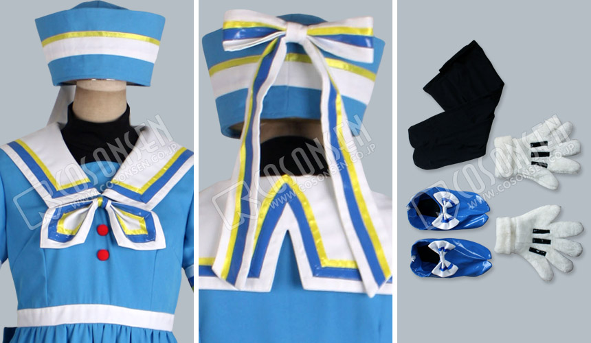 ブルーを基調したポリ混紡生地で製作します。襟の部分はセーラー服みたいにしています。
