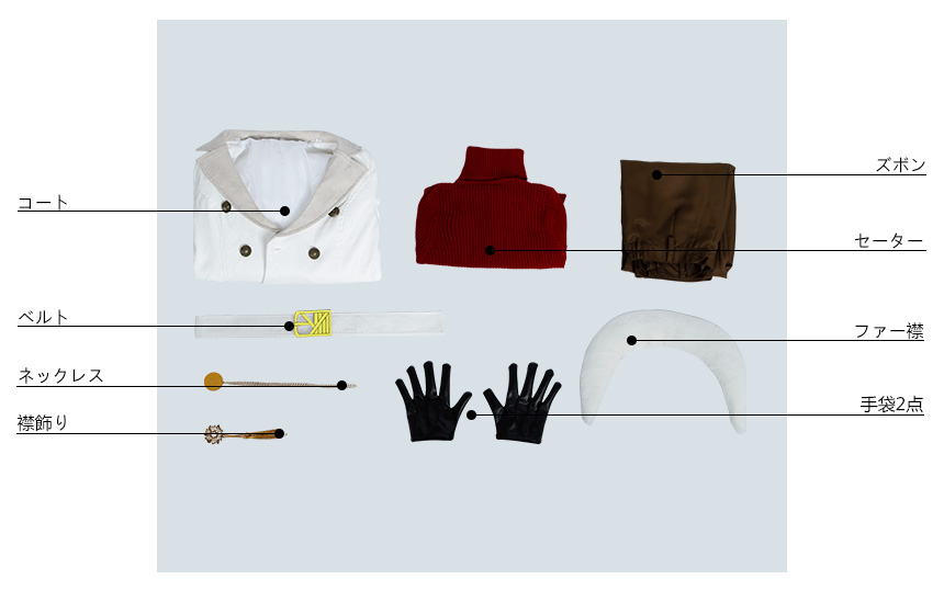 ベルト、ネックレス、襟飾り、手袋2点、ファー襟も付属しています。