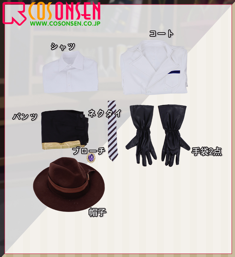 コート、シャツ、パンツ、飾り物(帽子、ブローチ、ネクタイ、ベルト、手袋2点)
