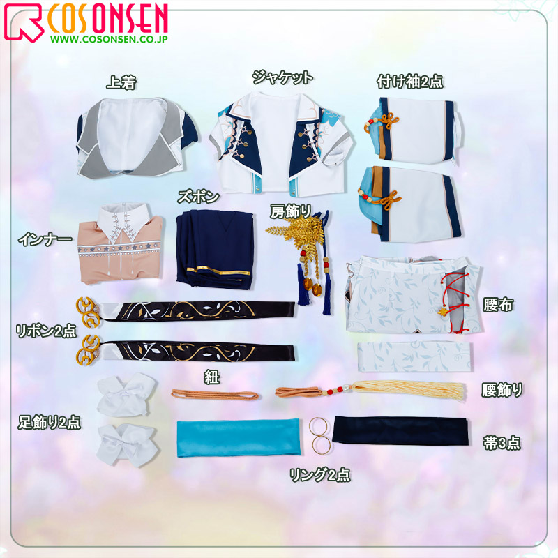 ジャケット、上着、インナー、ズボン、飾り物(房飾り、付け袖2点、リング2点、リボン2点、腰布、帯3点、紐、腰飾り、足飾り2点)