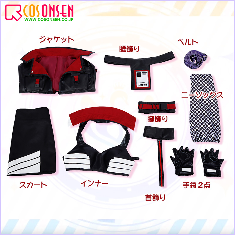 ジャケット、インナー、スカート、飾り物(首飾り、腰飾り、ベルト、手袋2点、脚飾り、ニーソックス)