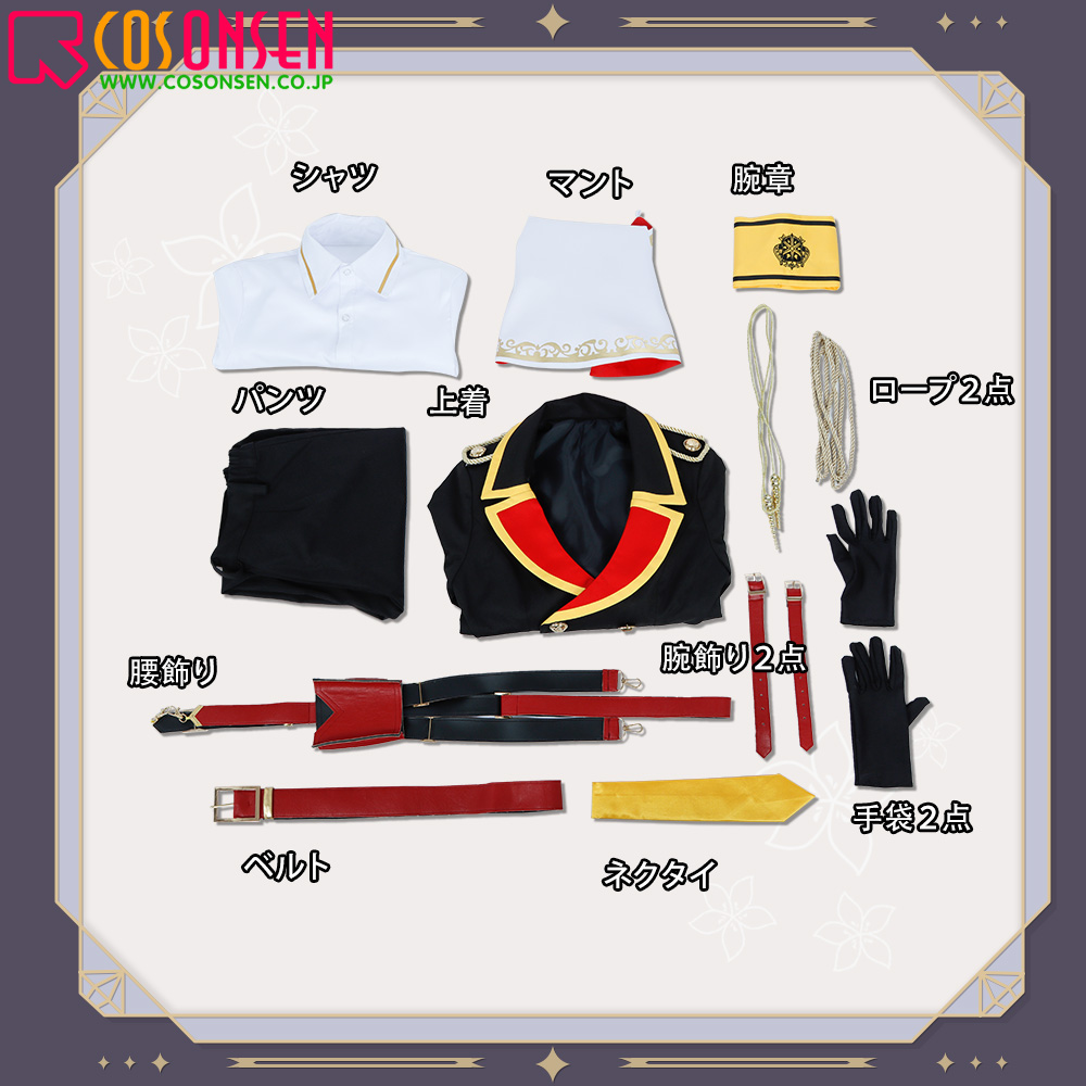 マント、上着、シャツ、パンツ、飾り物(ネクタイ、腕章、ロープ2点、手袋2点、腕飾り2点、ベルト、腰飾り)