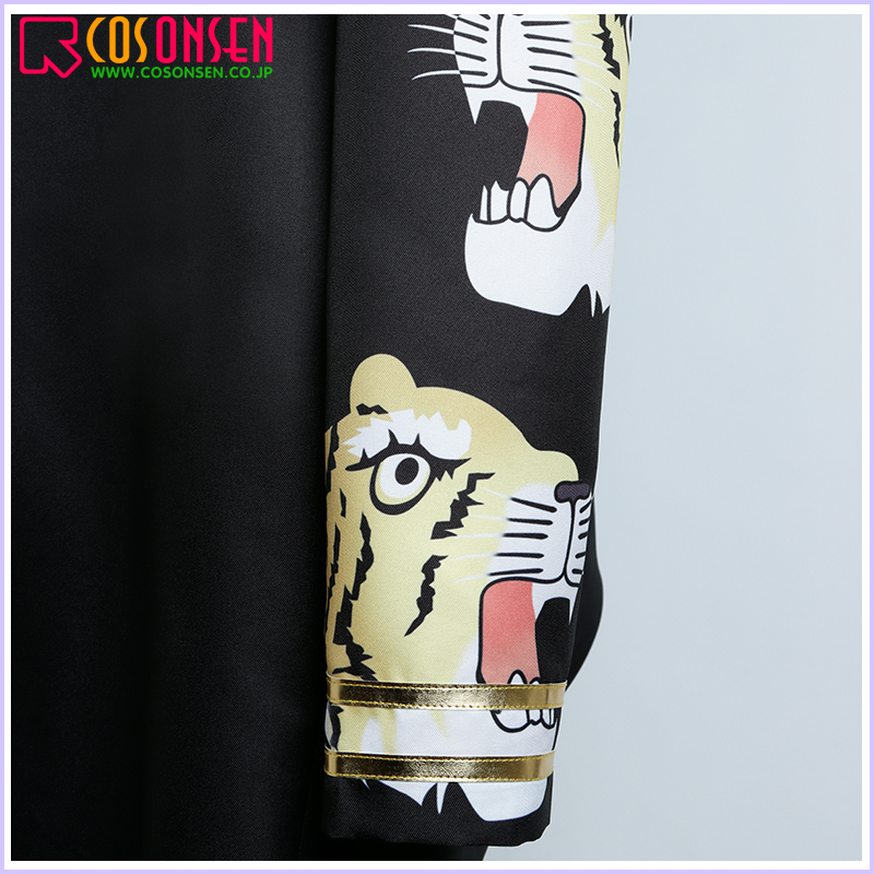 ポリエステルツイルで製作しています。フードが付いています。袖に虎の模様がプリントされて、金色のラインを縫い付けています。
