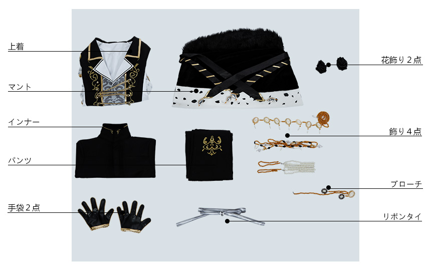マント、上着、インナー、パンツ、飾り物(リボンタイ、ブローチ、手袋2点、飾り4点、花飾り2点)