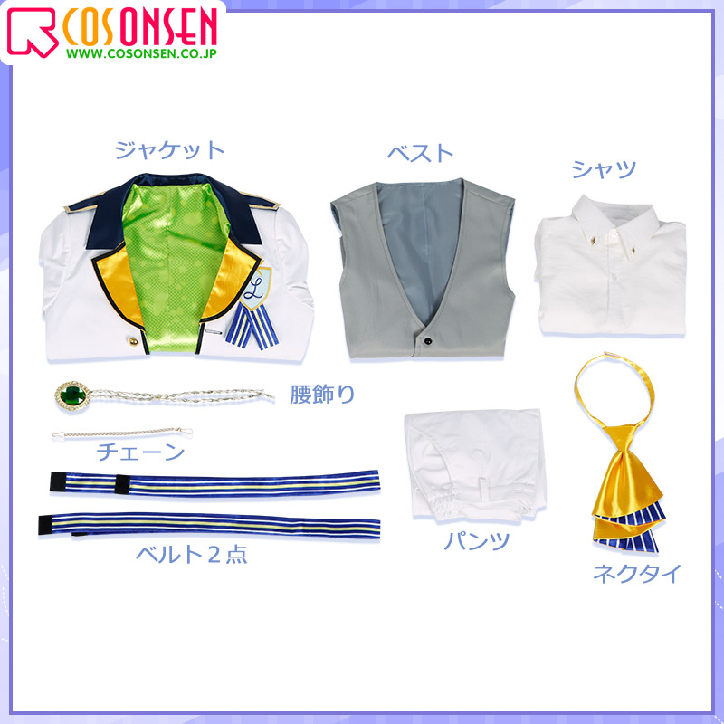 ジャケット、ベスト、シャツ、パンツ、飾り物(ネクタイ、ベルト2点、腰飾り、チェーン)