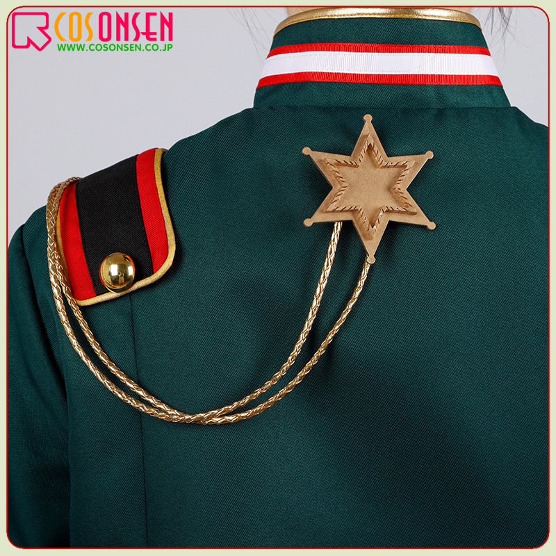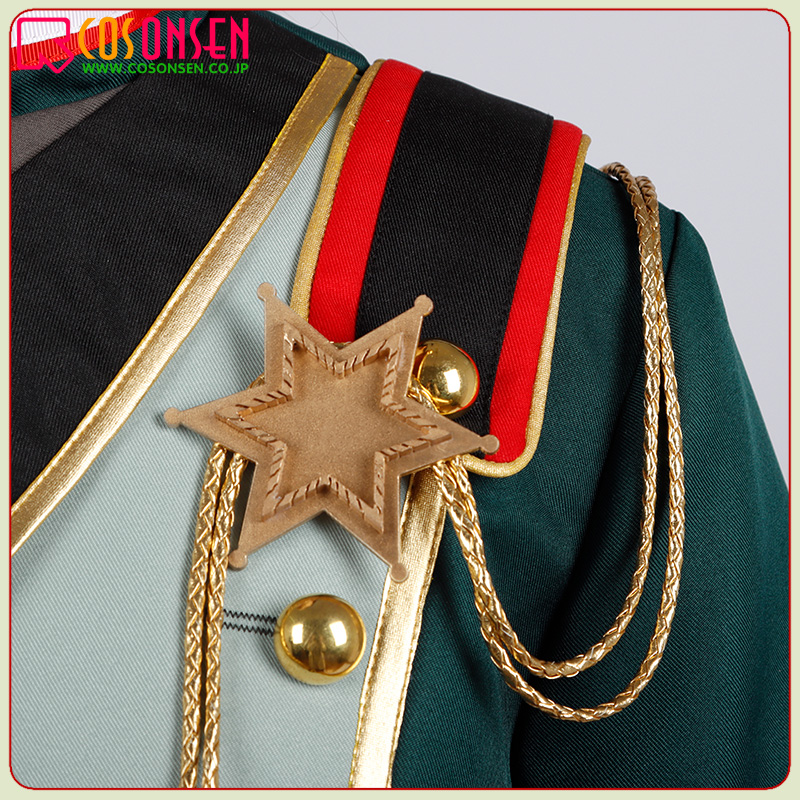 ポリエステルツイルで制作しています。半袖のデザインで、フロントにボタンで留めています。袖と肩にエポーレットが飾っており、原作を忠実に再現するよう心掛けています。