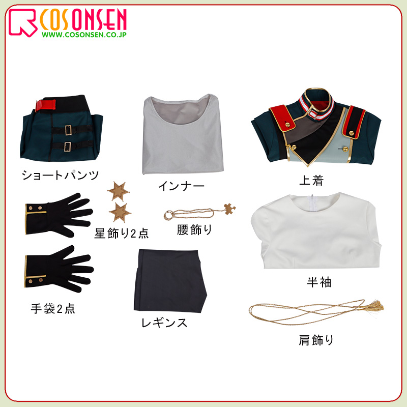 上着、半袖、インナー、ショートパンツ、飾り物(手袋2点、肩飾り、星飾り2点、腰飾り、レギンス)