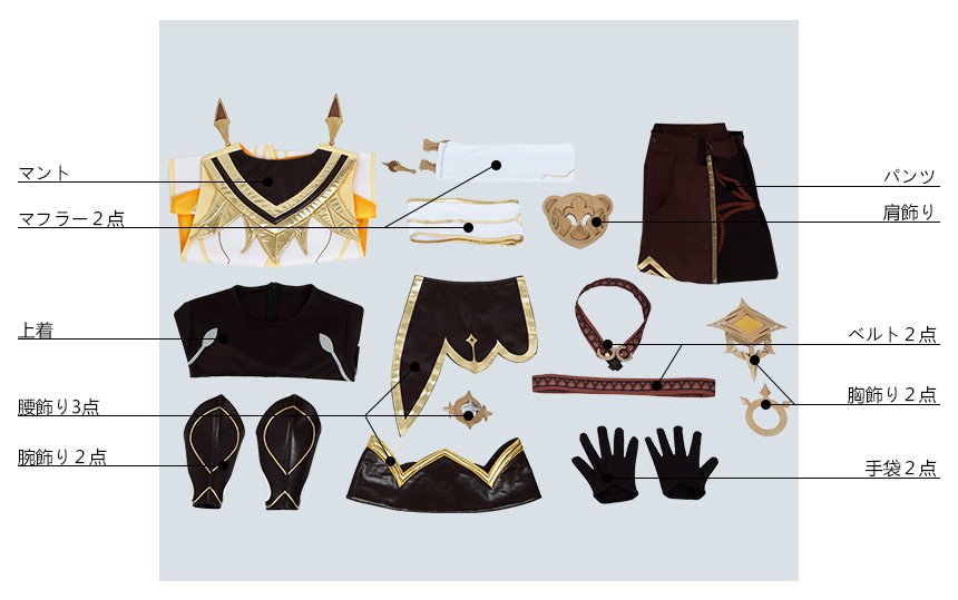マント、上着、パンツ、飾り物(マフラー、肩飾り、胸飾り2点、手袋2点、腕飾り2点、腰飾り2点、ベルト2点)