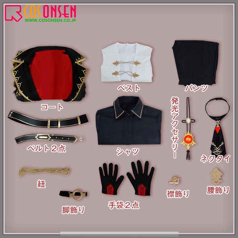 コート、ベスト、シャツ、パンツ、飾り物(ネクタイ、紐、襟飾り、発光アクセサリー、手袋2点、腰飾り、ベルト2点、脚飾り)