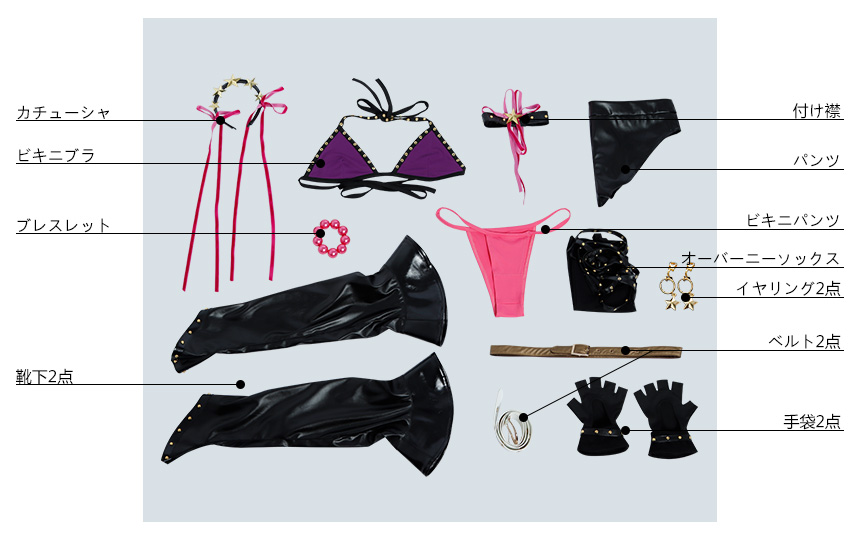 ビキニブラ、ビキニパンツ、パンツ、飾り物(カチューシャ、イヤリング2点、付け襟、ベルト2点、靴下2点、手袋2点、ブレスレット、オーバーニーソックス2点)