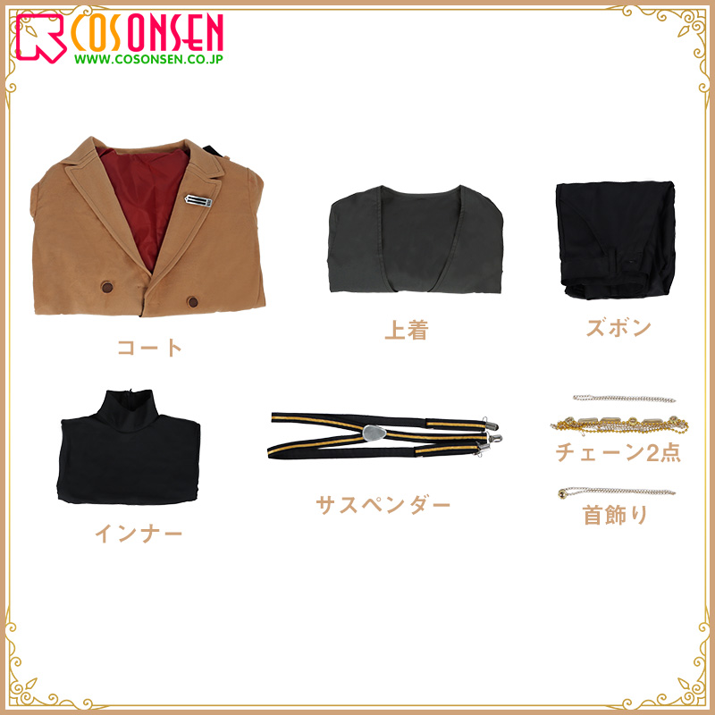 コート、上着、インナー、ズボン、飾り物(首飾り、サスペンダー、チェーン)