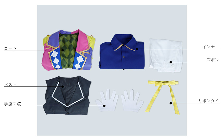 コート、ベスト、インナー、ズボン、飾り物(リボンタイ、手袋2点)