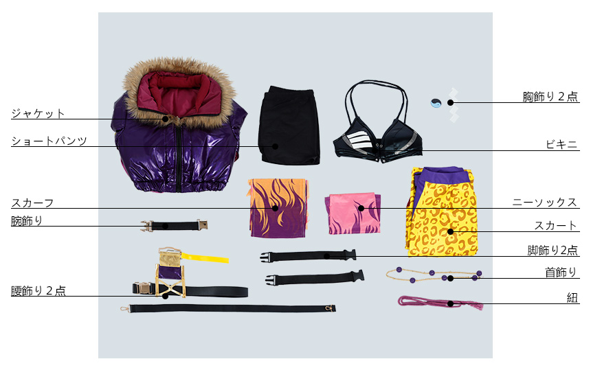 ジャケット、ビキニ、ショートパンツ、飾り物(スカーフ、首飾り、紐、胸飾り2点、腕飾り、腰飾り2点、腰布、ニーソックス、脚飾り2点)