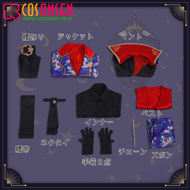 マント、ジャケット、ベスト、インナー、ズボン、飾り物(ネクタイ、腰帯、手袋2点、チェーン)