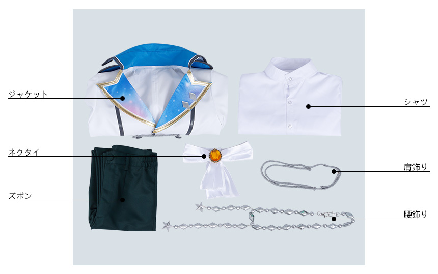 ジャケット、シャツ、ズボン、飾り物(肩飾り、ネクタイ、腰飾り)