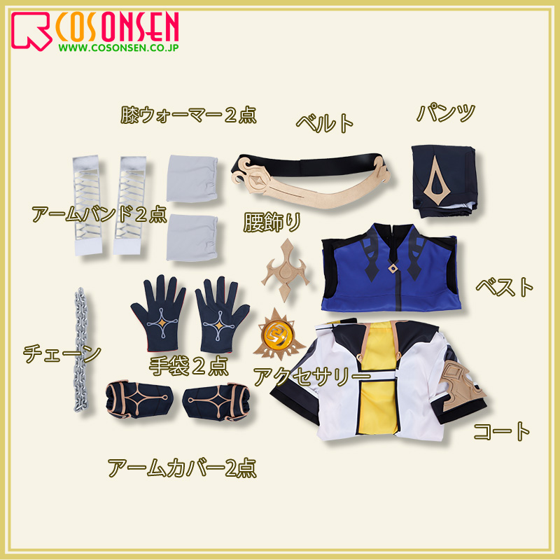 コート、ベスト、パンツ、飾り物(アームカバー2点、アームバンド2点、手袋2点、腰飾り、チェーン、ベルト、膝ウォーマー2点)