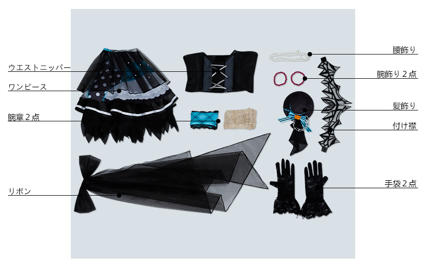 ワンピース、飾り物(肩飾り、腕章2点、ウエストニッパー、腕飾り2点、手袋2点、腰飾り、リボン)