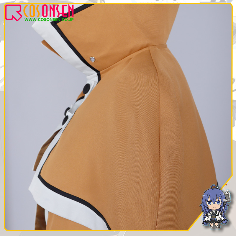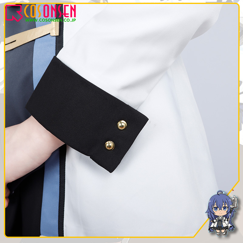 ポリエステルツイルで制作しています。襟はラバティンカラーのデザイン、肩に垂れ下がる、ケープのような形状で、特徴が再現しています。胸元に交差したサスペンダーが付けていて、青と黒の組合せのラインが施されています、とても綺麗に見えます。