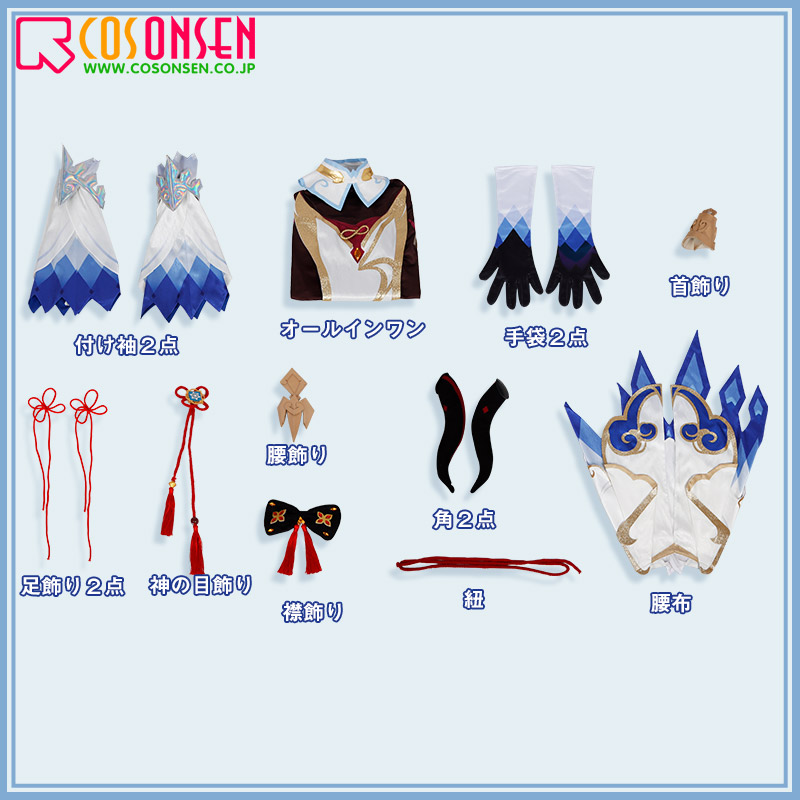 オールインワン、飾り物(手袋2点、付け袖2点、首飾り、足飾り2点、神の目飾り、襟飾り、紐、腰布、腰飾り、角2点)