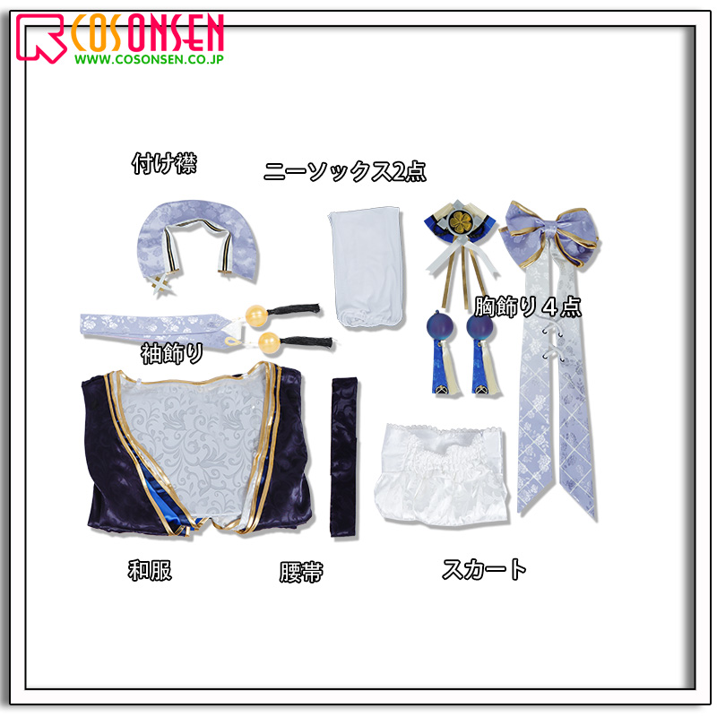 和服、スカート、飾り物(付け襟、袖飾り、胸飾り4点、腰帯、ニーソックス2点)