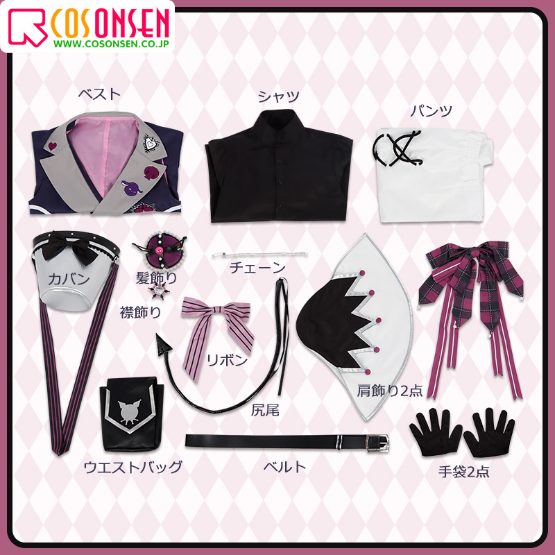 ベスト、シャツ、パンツ、飾り物(髪飾り、リボン、肩飾り2点、襟飾り、チェーン、手袋2点、ベルト、ウエストバッグ、カバン、尻尾)