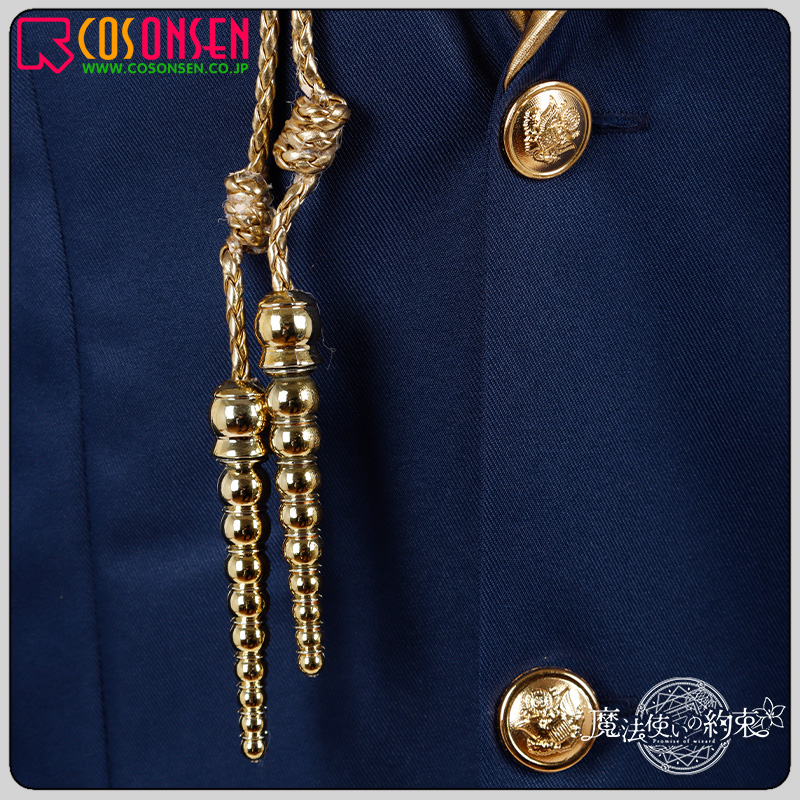 ポリエステルツイルで制作しています。フロントに厳選されたボタンを縫い付けています。襟と袖に金色のラインがプリントされています。原作に忠実な飾緒が綺麗に飾られて再現度が高いです。