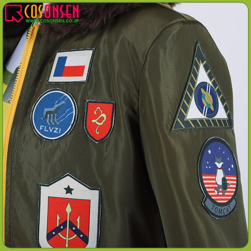ポリエステルで制作しています。ファー襟付きのデザインで、胸元に黄色のファスナーで飾られています。原作に忠実な図柄が綺麗に施されていて、再現度が高いです。