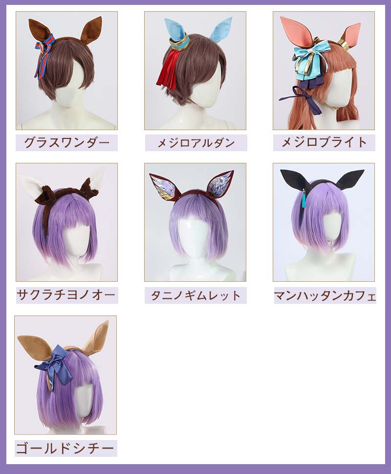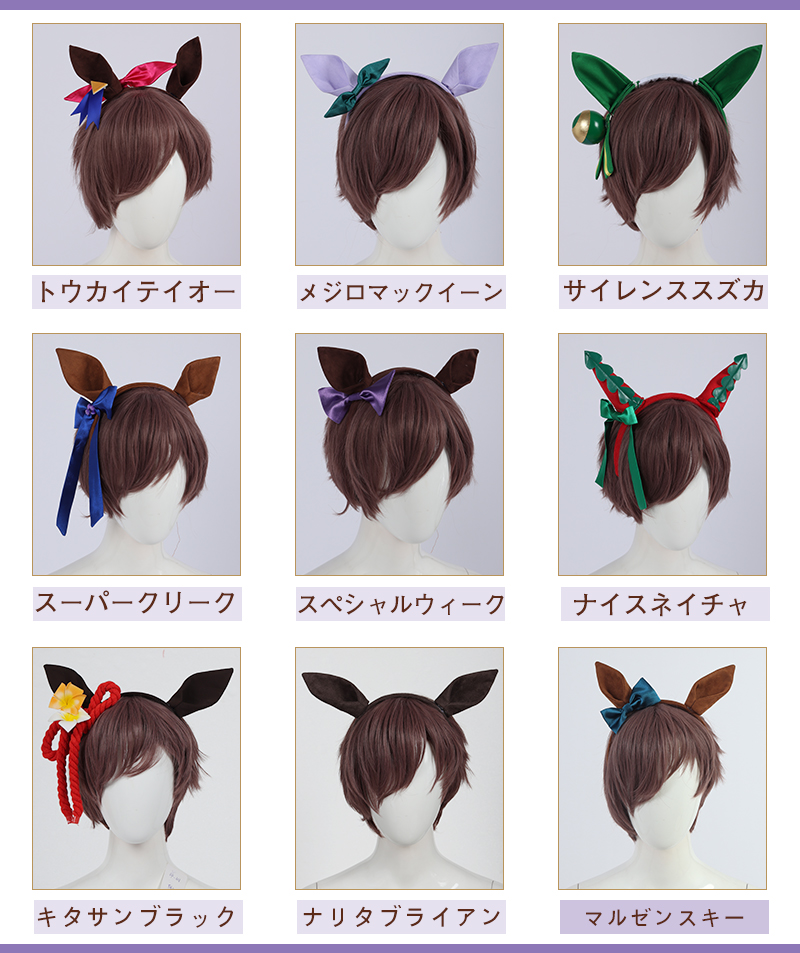 キャラクターにより髪飾りが違いますので、ご注文の際ぜひ備考欄にご希望のキャラクターを記入してください。ダイワスカーレットのティアラのみ追加料金1000円がかかります。ご了承ください。