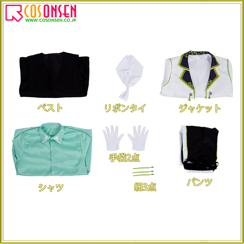 ジャケット、ベスト、シャツ、パンツ、飾り物(リボンタイ、手袋2点,、紐3点)