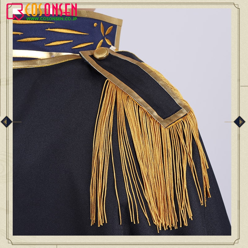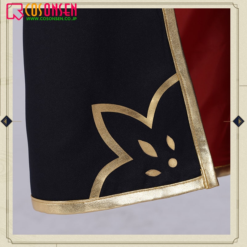 ポリエステルツイルで制作しています。黒を基調をとして、かっこいい印象を与えられます。裾の周りに金色の縁取りされていて、原作を忠実に再現するよう心掛けています。