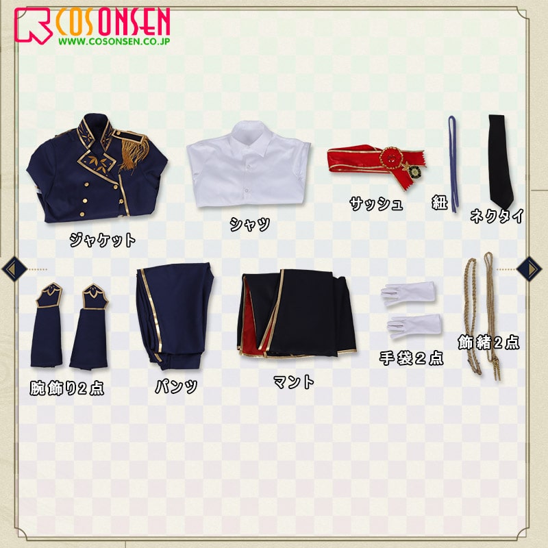 マント、ジャケット、シャツ、パンツ、飾り物(ネクタイ、紐、飾緒2点、サッシュ、手袋2点、腕飾り2点)