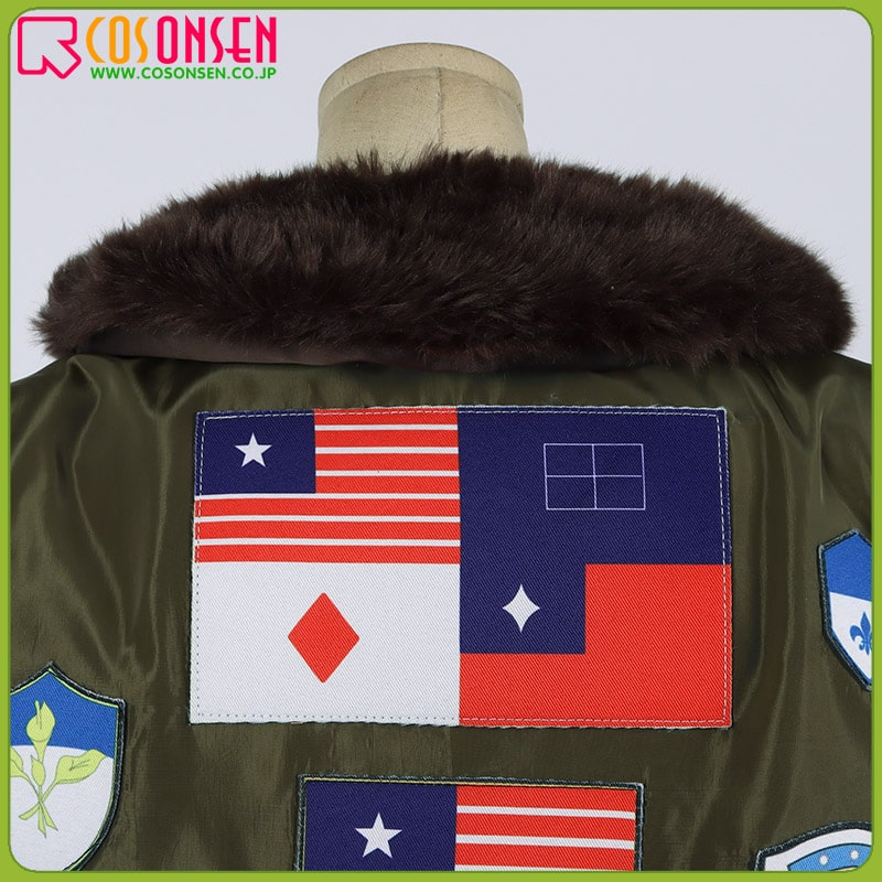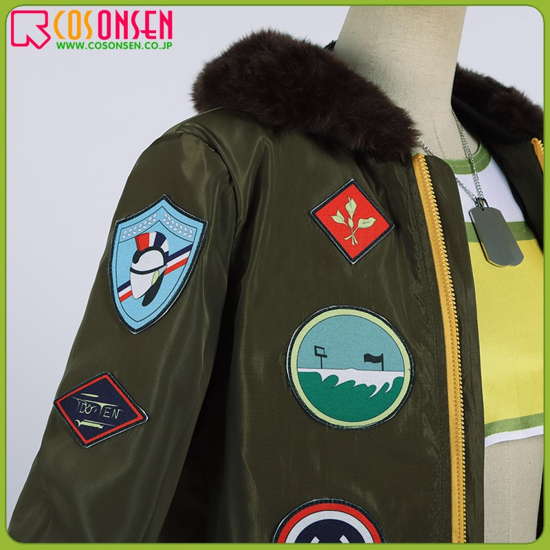 ポリエステルで制作しています。ファー襟付きのデザインで、胸元に黄色のファスナーで飾られています。原作に忠実な図柄が綺麗に施されていて、再現度が高いです。