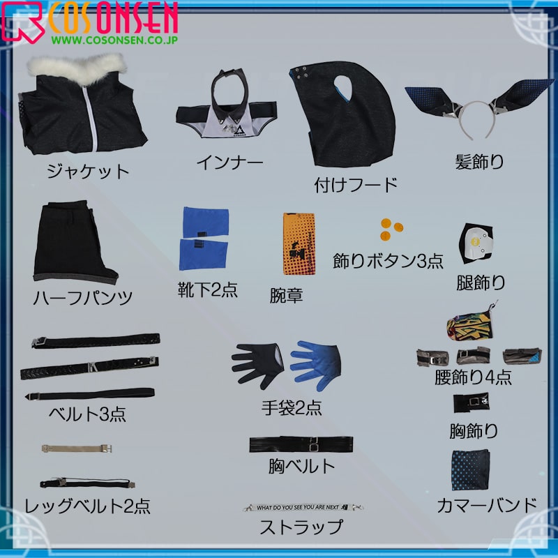 ジャケット、インナー、ハーフパンツ、飾り物(付けフード、髪飾り、胸飾り、胸ベルト、手套2只、腕章、ベルト3点、腰飾り4点、カマーバンド、飾りボタン3点、ストラップ、レッグベルト2点、腿飾り、靴下2点)