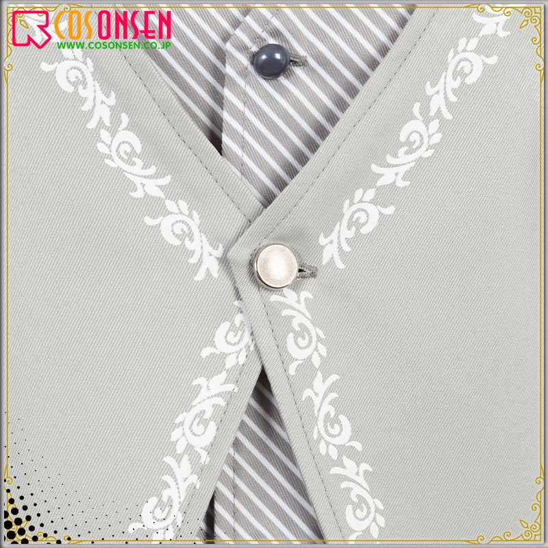ポリエステルツイルで制作しています。灰色を基調として、外のベストは襟周りと裾に特徴的な模様がプリントされていて、裏のベストは灰白縞模様となります。
