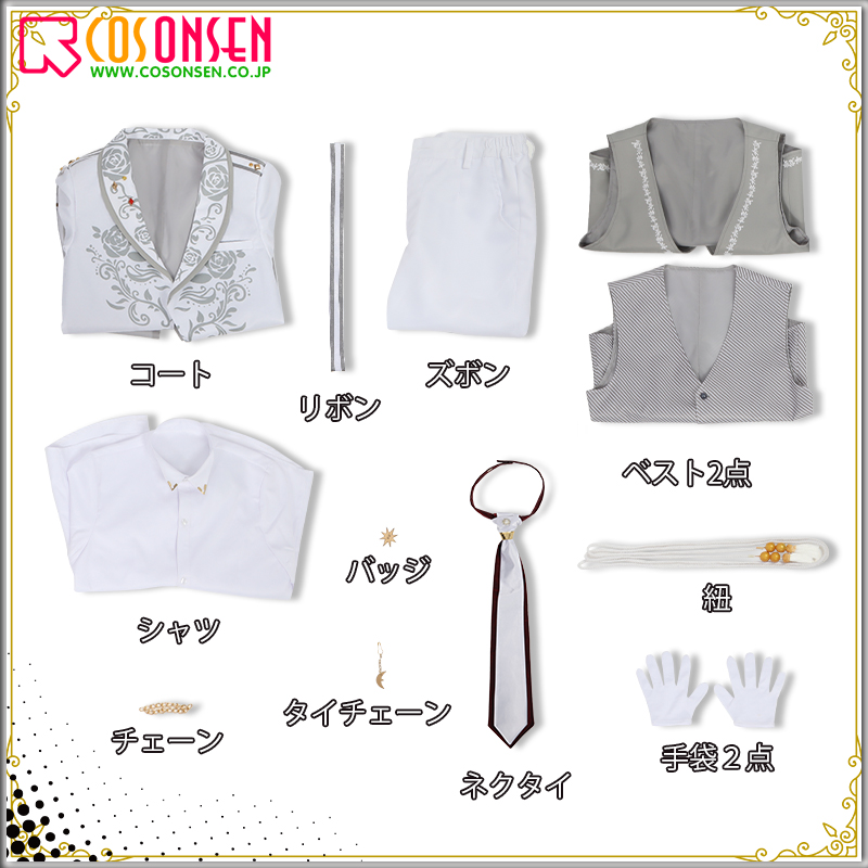 コート、ベスト2点、シャツ、ズボン、飾り物(ネクタイ、タイチェーン、リボン、紐、チェーン、手袋2点、バッジ)