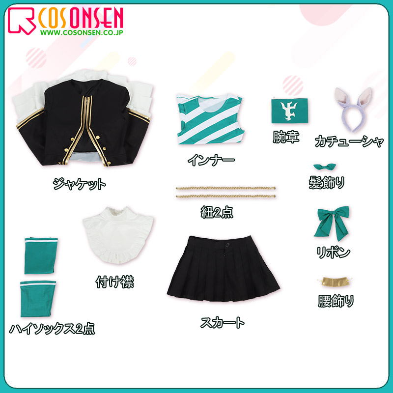 ジャケット、インナー 、スカート、飾り物(髪飾り、カチューシャ、紐2点、リボン、腰飾り、腕章、付け襟、ハイソックス2点)