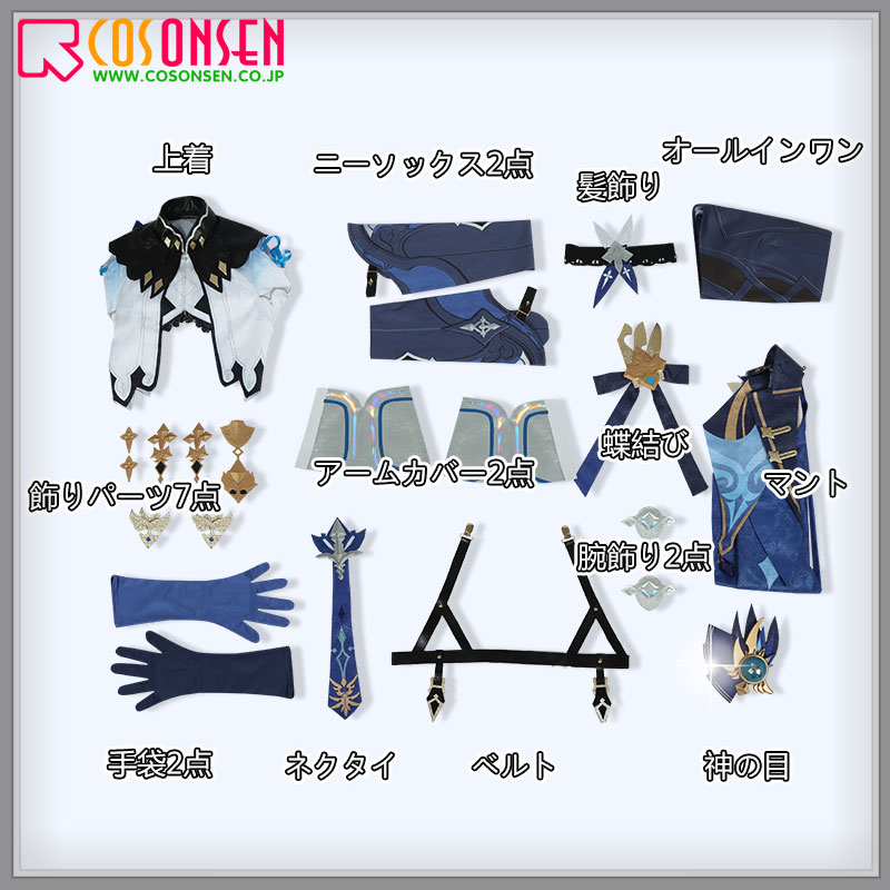 マント、上着、オールインワン、飾り物(髪飾り、ネクタイ、神の目、手袋2点、アームカバー2点、腕飾り2点、ベルト、蝶結び、ニーソックス2点、飾りパーツ7点)