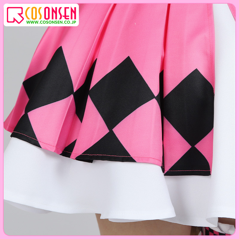 シフォン生地とポリエステルギャバで制作しています。ピンクを基調として、ジャンパースカートのデザインです。裾に黒いの菱形模様がきれいにプリントされて再現度が高いです。