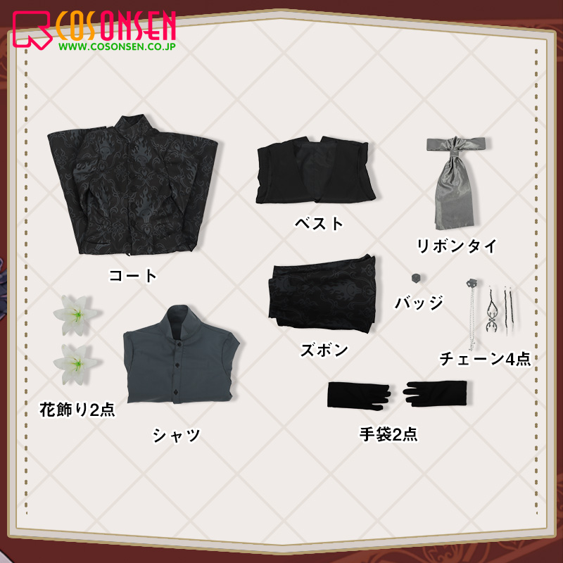 コート、ベスト、シャツ、ズボン、飾り物(リボンタイ、バッジ、手袋2点、花飾り2点、チェーン4点)