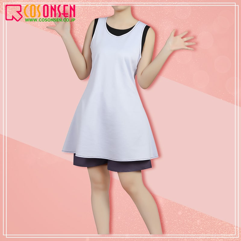 綿ポリ生地で制作しています。真っ白のシンプルなデザインで、日常でも着用できます。裾に黒いのラインが縫い付けられて、原作を忠実に再現するよう心掛けています。
