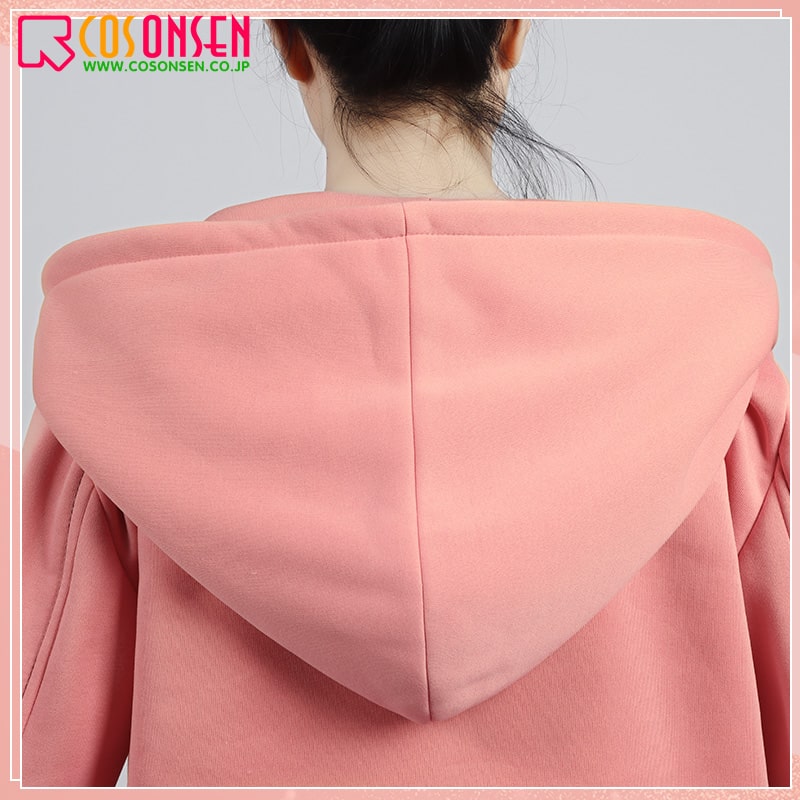 スウェットで制作しています。ピンクを基調として、フード付きのデザインです。袖に五角形の模様が縫い付けられて、綺麗に見えます。
