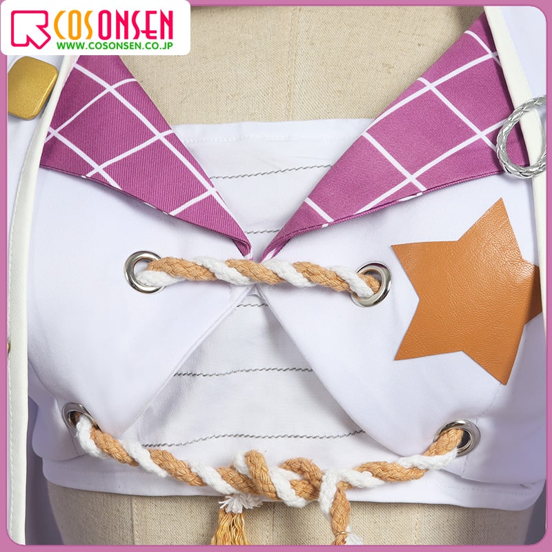 ダンボールニット生地とニット生地で制作しています。白を基調として、へそ出しのデザインです。襟に格子柄の模様が綺麗にプリントされて、胸元に合皮で星の模様が飾っており再現度が高いです。