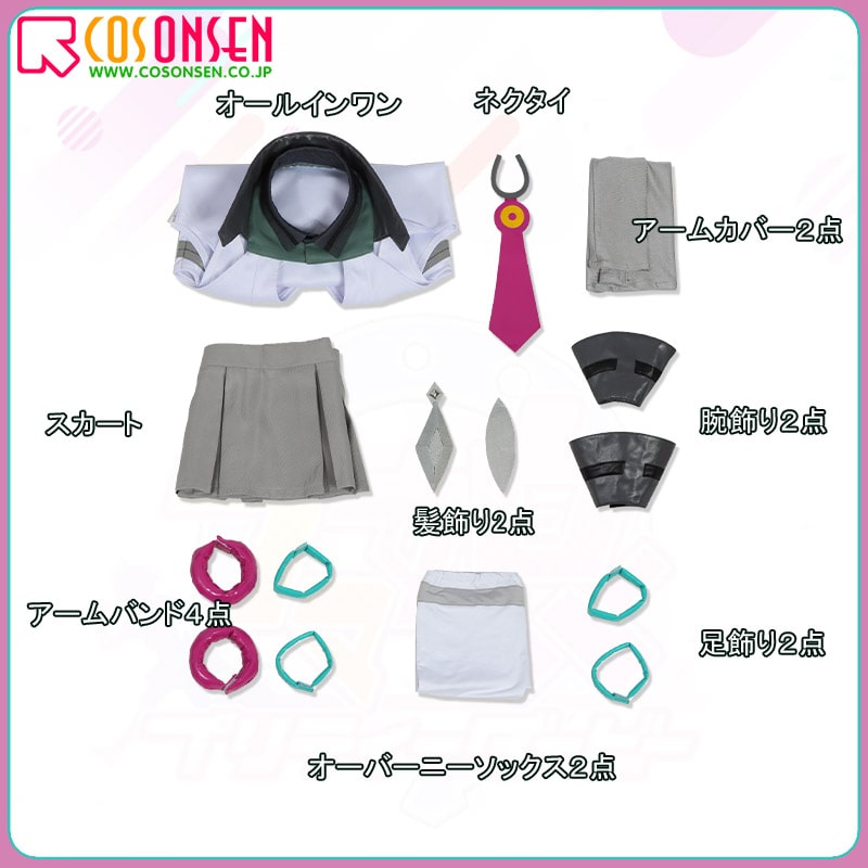 オールインワン、スカート、飾り物(髪飾り2点、ネクタイ、アームカバー2点、アームバンド4点、腕飾り2点、オーバーニーソックス2点、足飾り2点)