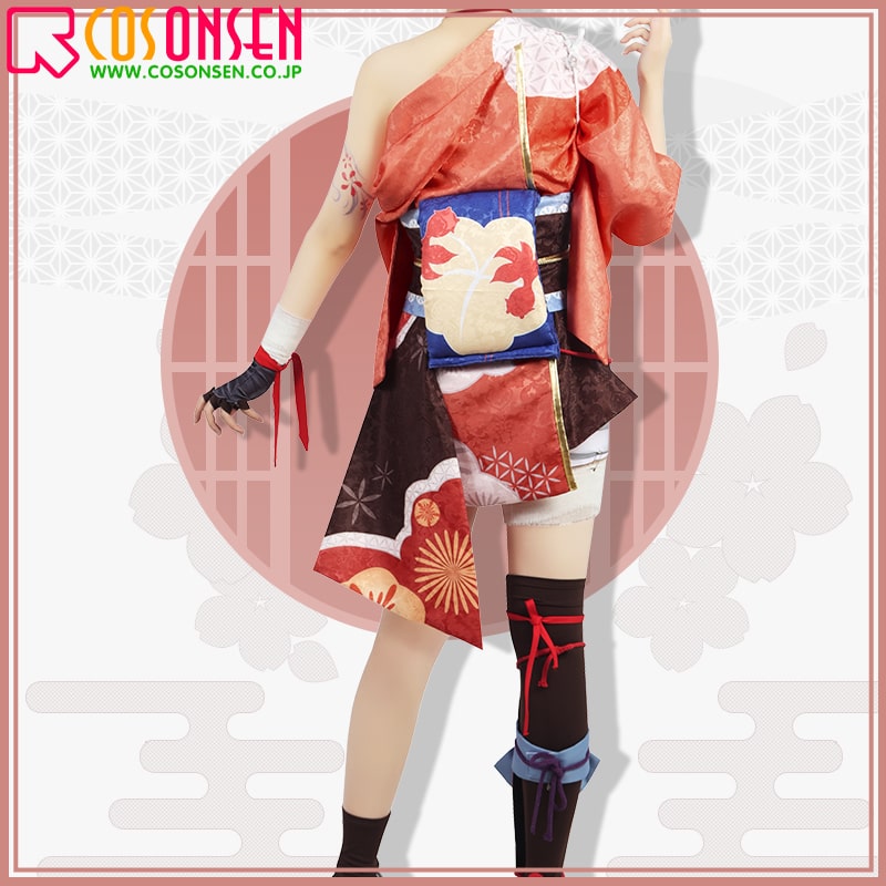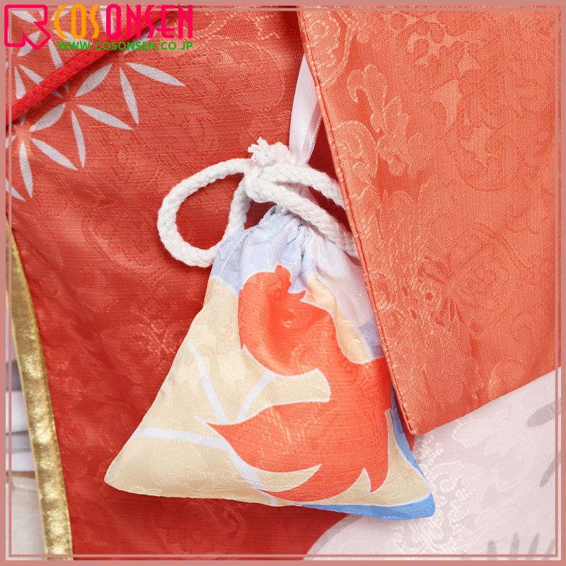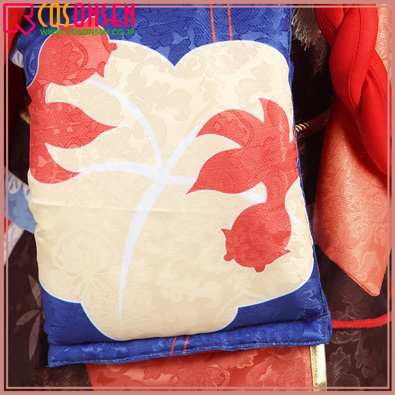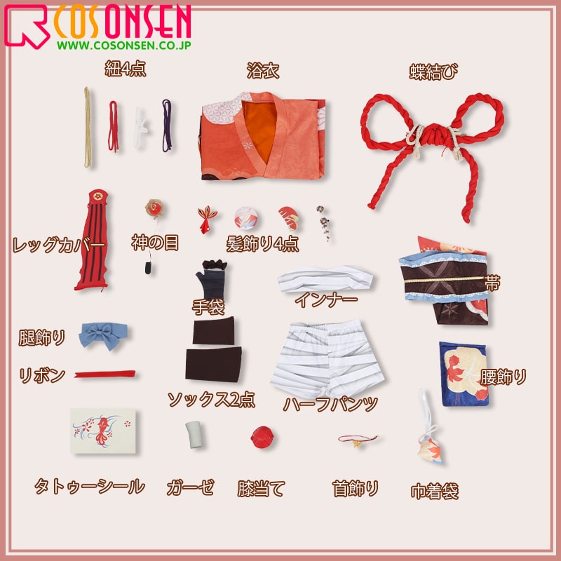 浴衣、インナー、ハーフパンツ、飾り物(髪飾り4点、首飾り、手袋、リボン、帯、腰飾り、巾着袋、蝶結び、膝当て、レッグカバー、腿飾り、ソックス2点、ガーゼ、タトゥーシール、紐4点、神の目)