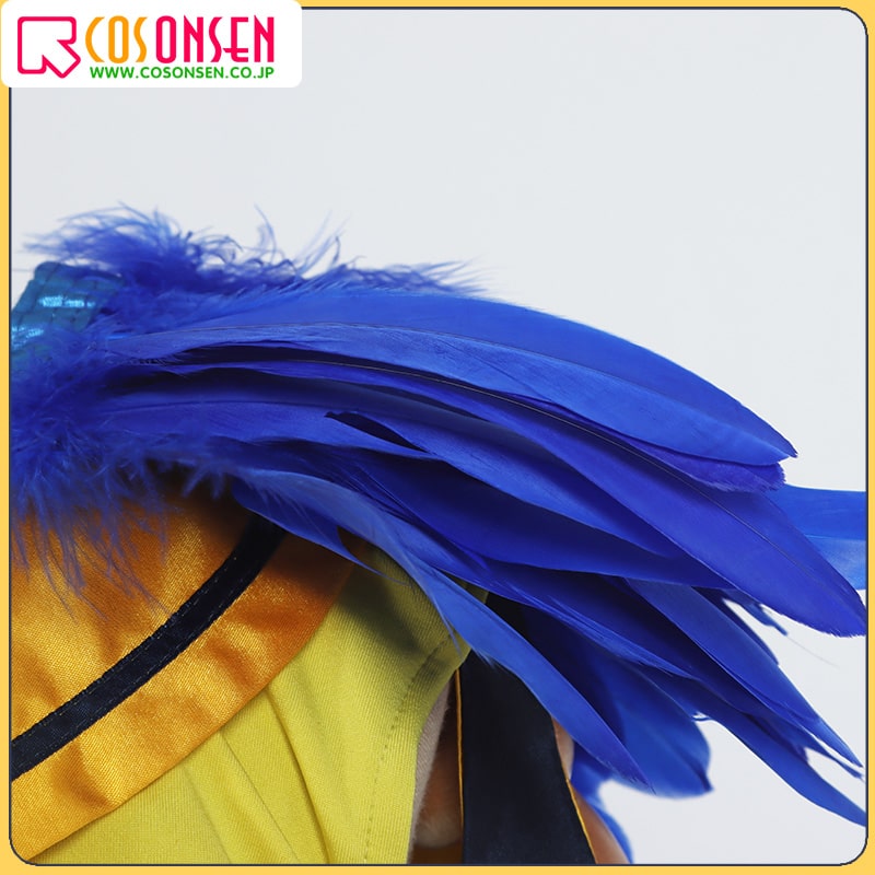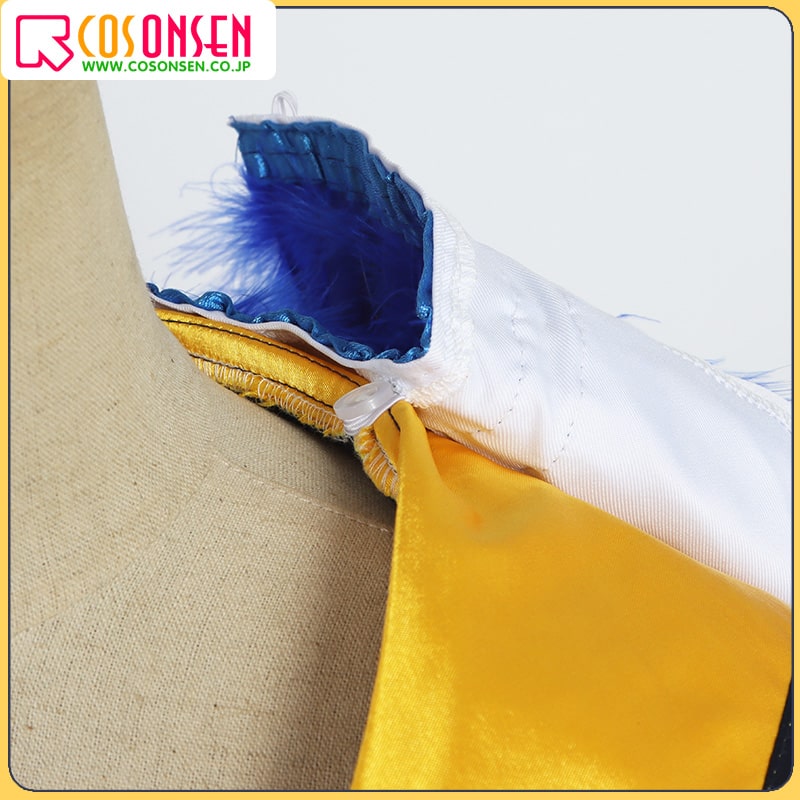 ポリエステルギャバで制作しています。白を基調として、上に縫い付けていた青いの羽が特徴です。原作を忠実に再現するよう心掛けています。