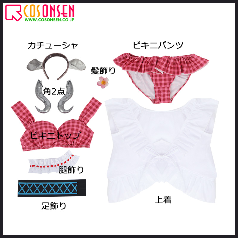 上着、ビキニトップ、ビキニパンツ、飾り物(髪飾り、カチューシャ、角2点、腿飾り、足飾り)