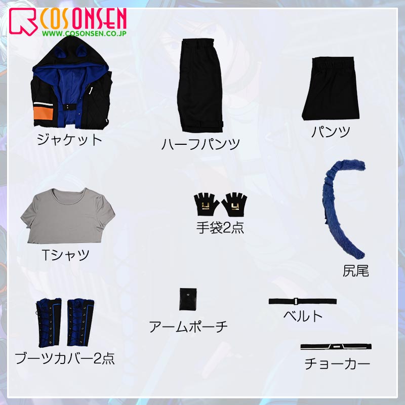 ジャケット、Tシャツ、ハーフパンツ、パンツ、飾り物(チョーカー、アームポーチ、手袋2点、ベルト、尻尾、ブーツカバー2点)